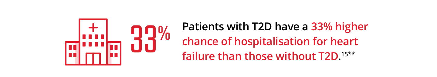 Patients with T2D have a 33% higher change of hospitalisation for HF than those without T2D.15**