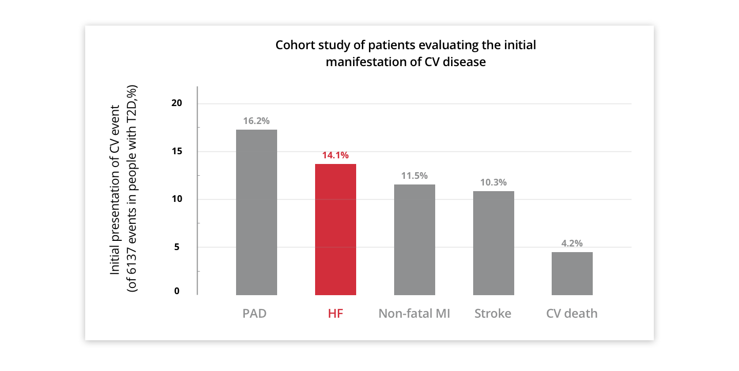 For patients with T2D, HF is a more common first CV complication than either myocardial infarction (MI) or stroke.8