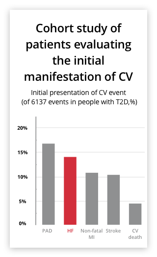 For patients with T2D, HF is a more common first CV complication than either myocardial infarction (MI) or stroke.8